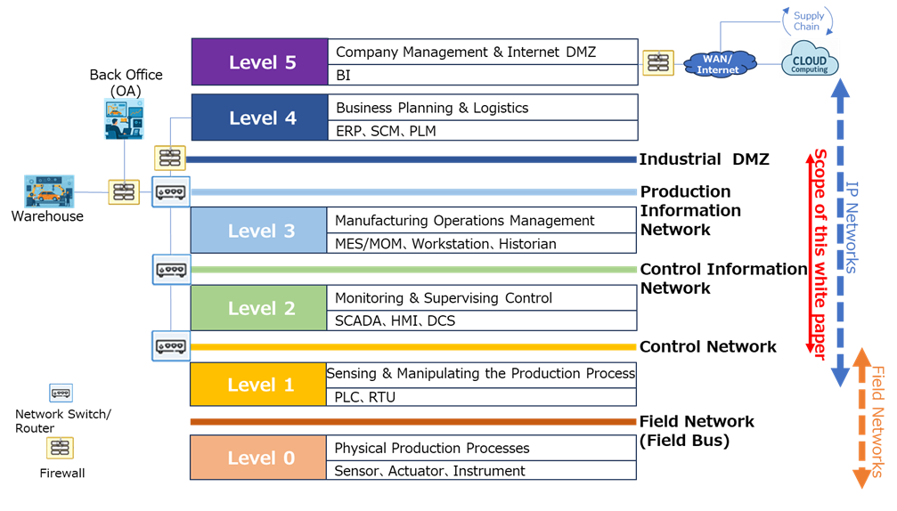 - 対象は工場内の製造現場と倉庫におけるネットワークセキュリティ。ISA‑95階層を前提に、IPネットワークが主となる領域を評価。サプライチェーン全体は範囲外。
